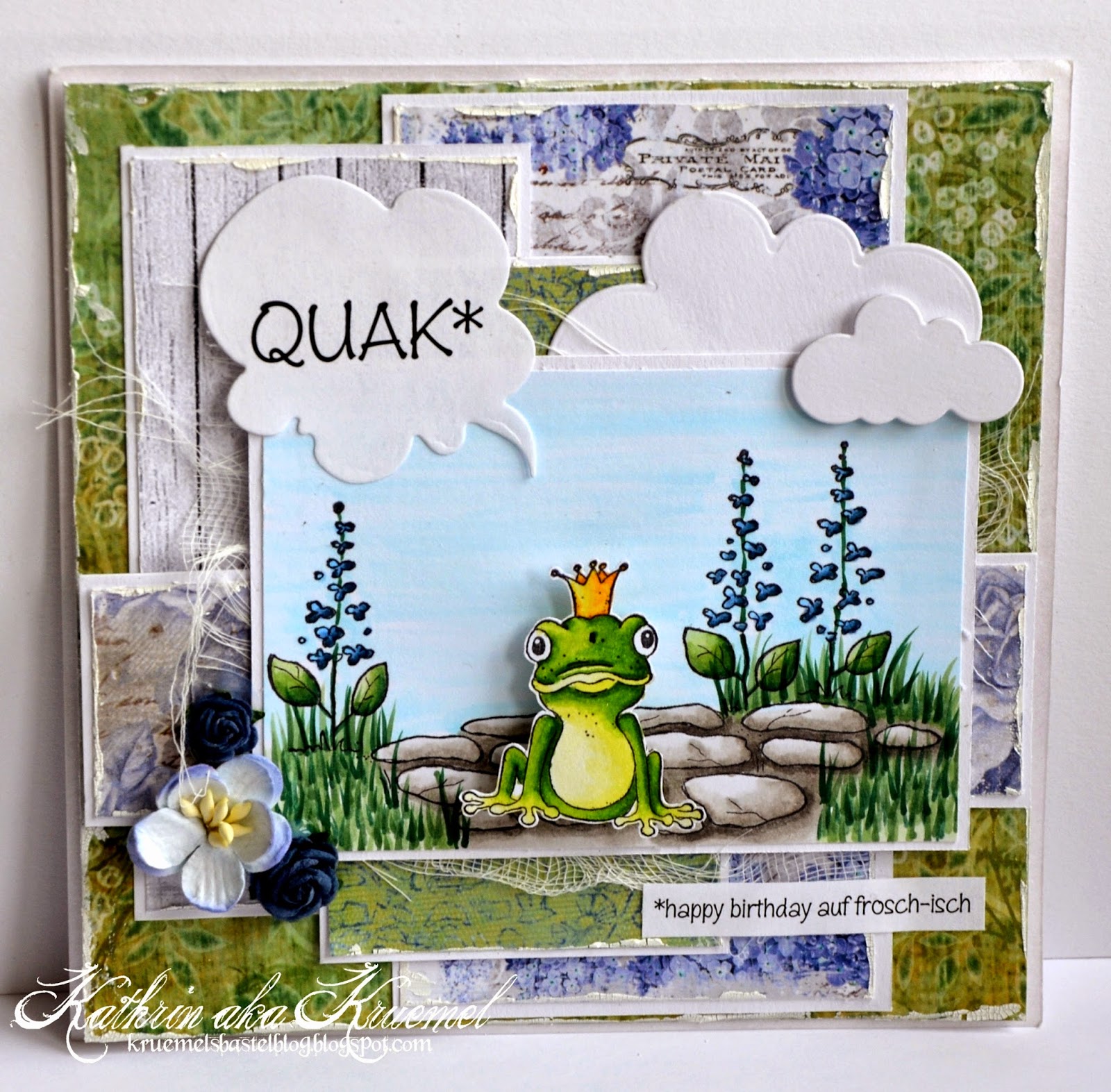 Für meine Karte habe ich den Stone Path von Magnolia zusammen mit dem Frog Prince kombiniert. Der Text ist mit dem Computer geschrieben und das Quak dann mit einer Sprechblasenstanze, ebenfalls von Magnolia, ausgestanzt.