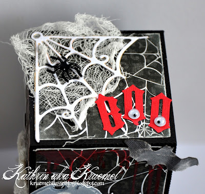Auf der Oberseite hat eine Spinne ihr Netz gebaut. Die Spinne ist mit Glossy Accents überzogen, so hebt sie sich besser vom Untergrund ab. Und dann schaut doch glatt ein kleines Monster durch die beiden Os meines BOO's...