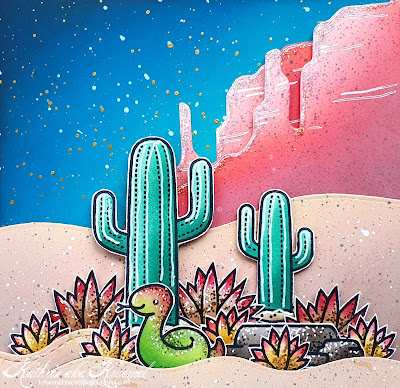 The smaller text is from the Critteres in the Desert set. I stamped it black onto white cardstock and since I was already ink blending like crazy I made the text strip match the colors of the cacti using Distress Ink Lucky Clover and Pine Needles.