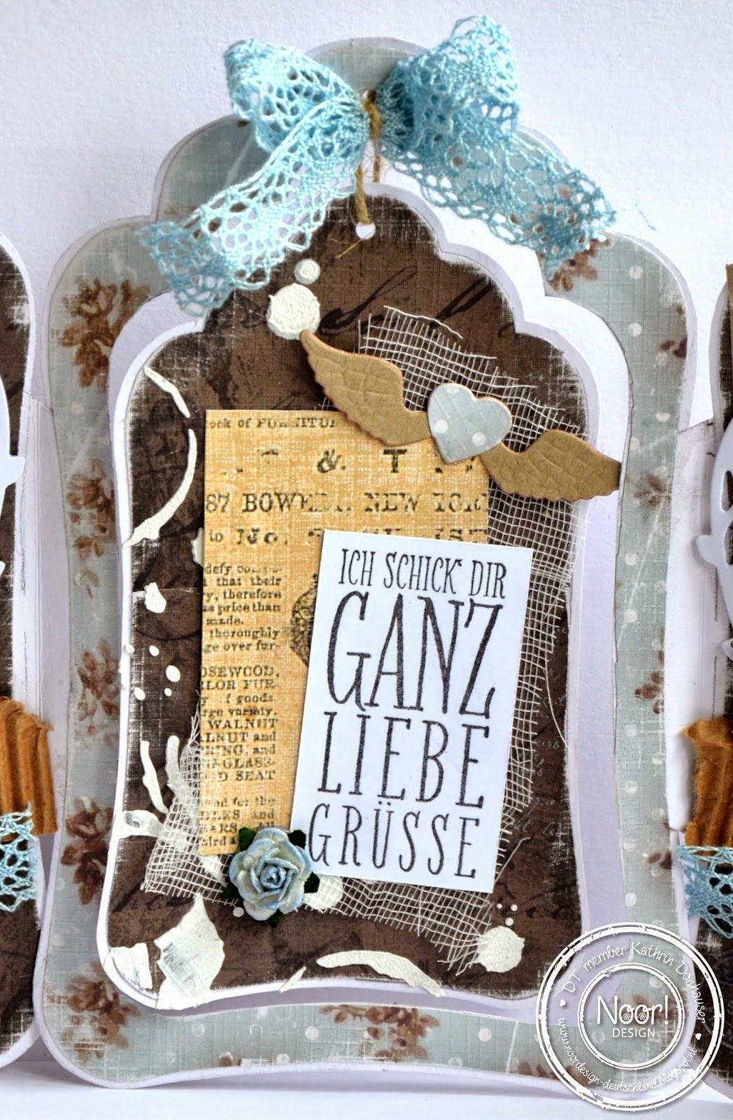 I had that designer's paper with a shingle look in my stash and that was perfect for the roof. The house itself is covered with designer's paper with a wooden print. The box was closed with a bow from white organza.